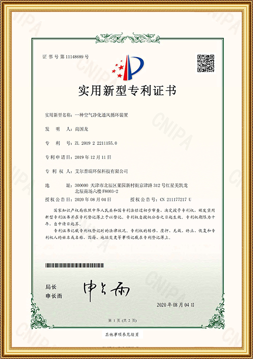 • 實用新型專利證書(一種空氣凈化通風循環裝置